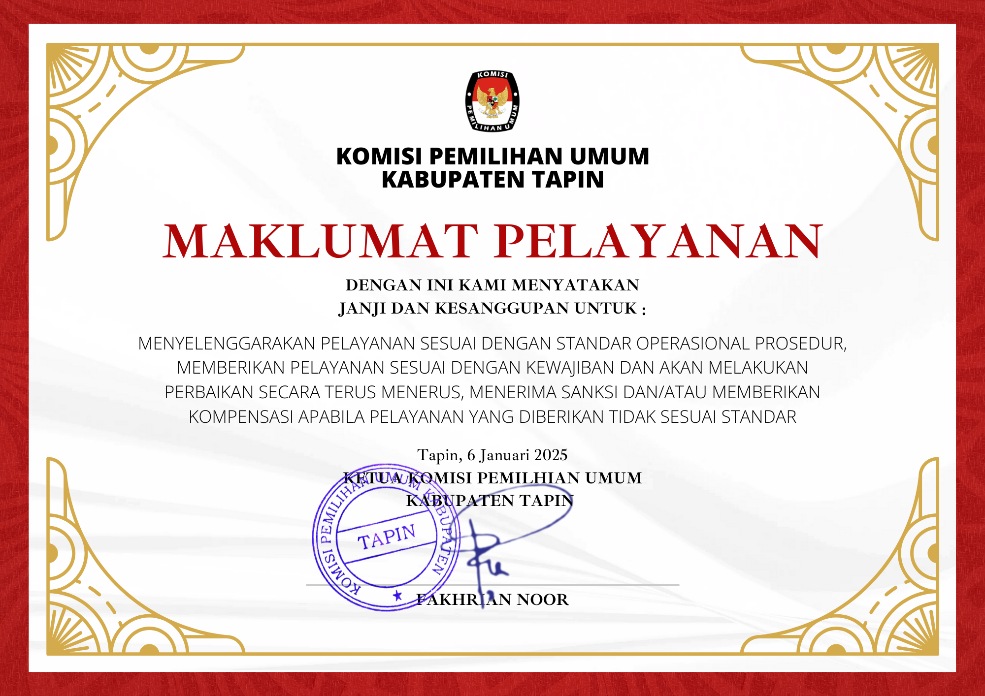 Sebagai bentuk komitmen dalam meningkatkan kualitas layanan publik, Komisi Pemilihan Umum (KPU) Kabupaten Tapin menetapkan Maklumat Pelayanan pada 6 Januari 2025. Melalui maklumat ini, KPU Kabupaten Tapin menegaskan kesanggupan untuk menyelenggarakan pelayanan sesuai standar operasional prosedur, melakukan perbaikan berkelanjutan, serta memberikan kompensasi atau menerima sanksi apabila pelayanan tidak sesuai dengan standar yang telah ditetapkan.