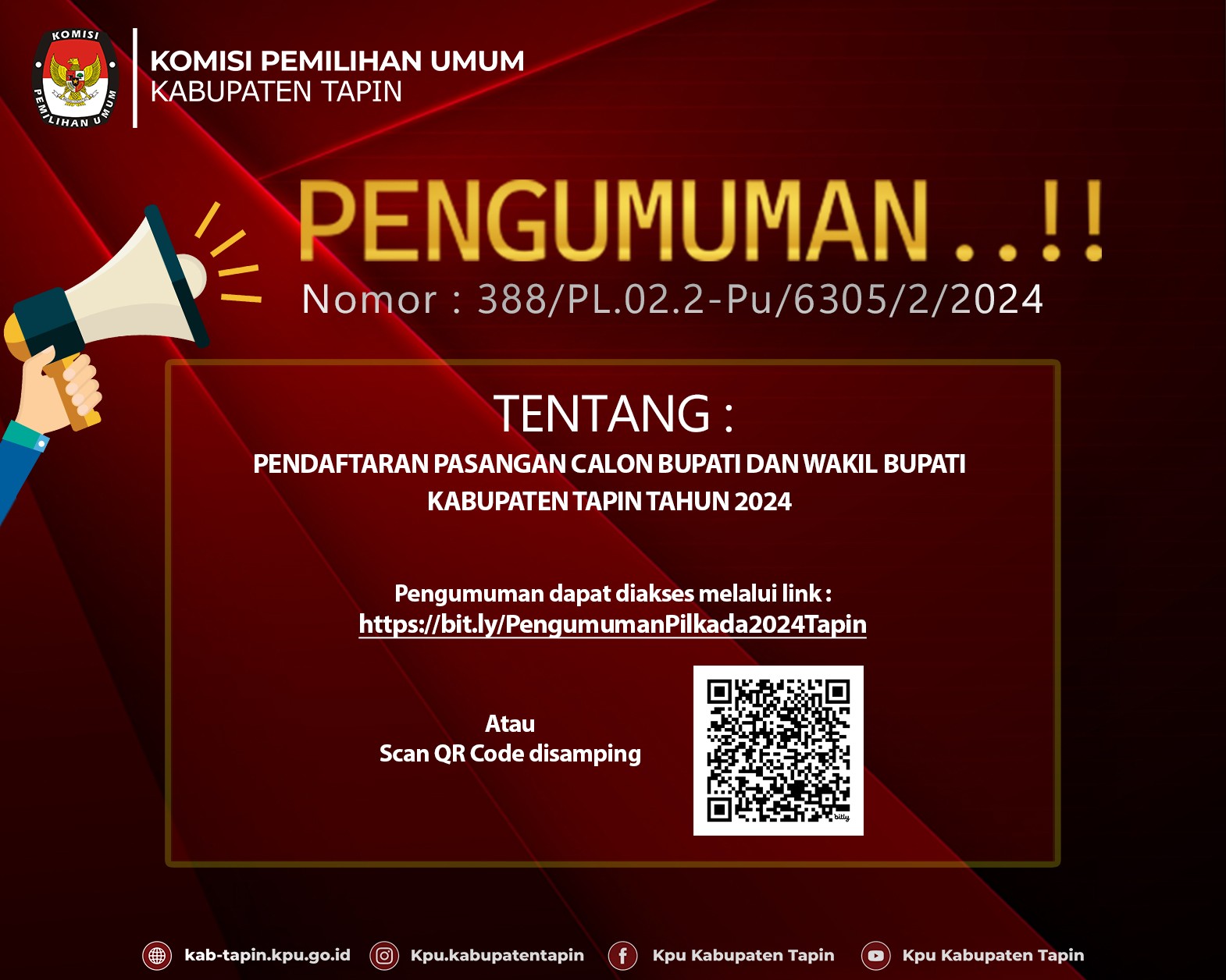 Pengumuman Hasil Penelitian Persyaratan Administrasi Pasangan Calon Bupati Dan Wakil Bupati Kabupaten Tapin Tahun 2024