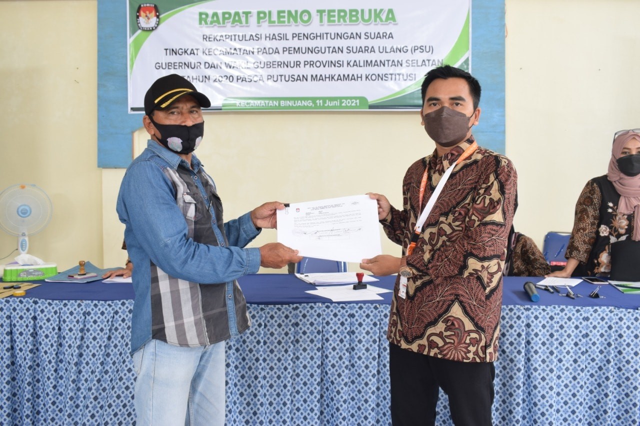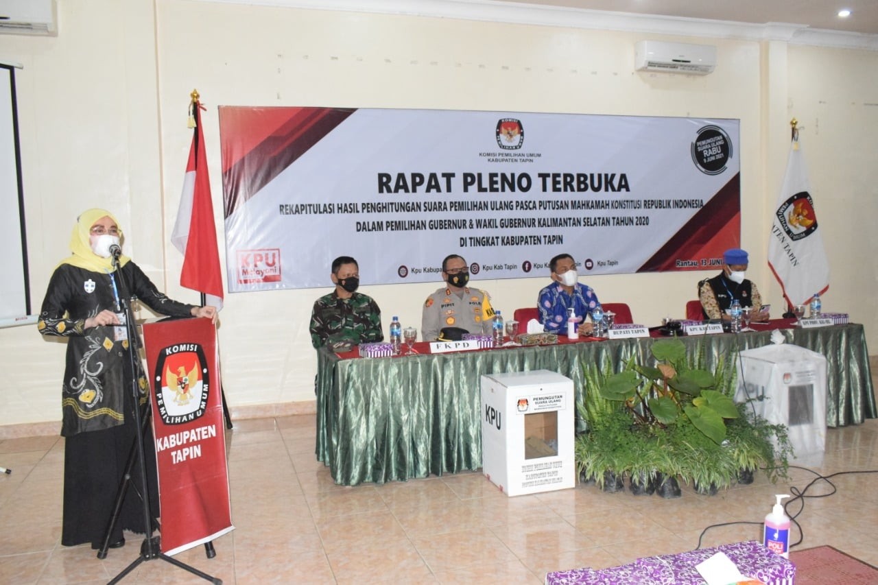 Rantau, kab-tapin.kpu.go.id ー Setelah Pleno Terbuka Rekapitulasi dan Penghitungan Suara Pemungutan Suara Ulang (PSU) Kecamatan Binuang oleh PPK rampung. Minggu 13 Juni 2021, KPU Kabupaten Tapin mengelar Rapat Pleno Rekapitulasi Penghitungan Suara PSU Pasca Putusan MK dalam Pemilihan Gubernur dan Wakil Gubernur Kalimantan Selatan Tahun 2020 tingkat Kabupaten Tapin di Aula Hotel Tapin Rantau. Pembukaan acara turut dihadiri Perwakilan Bupati Tapin, Kapolres Tapin, Kodim 1010 Rantau, Kejaksaan Negeri Rantau, Disdukcapil Tapin dan Kesbangpol Tapin. selain itu datang juga komisioner Provinsi Kalsel Siswandi Rayaan dan Edy Ariansyah mengikuti jalannya rapat pleno. Peserta rapat pleno adalah Anggota PPK Binuang, Bawaslu Kabupaten Tapin dan saksi dari Pasangan Calon nomor urut 1 dan 2. Saksi Paslon nomor urut 2 tidak hadir dalam rapat pleno ini. Dalam sambutan pembukaan Ketua KPU Kabupaten Tapin Hj. Henny Hendriyanti menyelipkan ucapan terima kasih kepada seluruh stakeholder dan Badan Adhoc penyelenggara atas segala dukungan terlaksananya PSU di 24 TPS Kecamatan Binuang yang berjalan lancar dan kondusif. Rekapitulasi penghitungan surat suara dimulai dengan membuka kotak suara tersegel yang berisi dokumen Rekapitulasi Hasil Penghitungan Suara PSU di tingkat Kecamatan Binuang dengan diawasi oleh Bawaslu Kabupaten Tapin dan disaksikan Saksi Pasangan Calon kemudian dibacakan oleh Ketua PPK H. Henderiyanoor Efendi. Selanjutnya Bawaslu Kabupaten Tapin serta Saksi Paslon dimintai tanggapan, dalam hal ini Bawaslu Kabupaten Tapin dan Pasangan Calon berhak menyanggah jika terdapat perbedaan dengan menyertakan bukti yang outentik. Rapat kemudian ditutup dengan menuangkan dalam Berita Acara dan Sertifikat Rekapitulasi Hasil Penghitungan Suara (Model D-HASIL KABUPATEN PEMILIHAN ULANG-KWK) dimana Pasangan Calon nomor urut 1 yaitu H. Sahbirin Noor, S.Sos,. MH dan H Muhidin memperoleh 44.800 suara dan Pasangan Calon nomor urut 2 yaitu Prof H Denny Indrayana, SH, LL.M, Ph.D dan Drs H Difriadi memperoleh 34.096 suara. Jumlah rekapitulasi ini merupakan jumlah keseluruhan dari Kabupaten Tapin setelah dilaksanakan PSU di 24 TPS Kecamatan Binuang. Berita Acara selanjutnya ditandatangani oleh seluruh Anggota KPU Kabupaten Tapin dan Saksi Pasangan Calon nomor urut 1. Kemudian Sertifikat Model D-HASIL KABUPATEN/KOTA-KWK yang telah di tandatangani dimasukkan kedalam kotak suara bersegel dan diberikan salinannya kepada Bawaslu dan saksi Pasangan Calon. Kotak Suara bersegel selanjutnya di kirim ke KPU Provinsi Kalimantan Selatan pada hari itu juga dengan pengawalan dari Kepolisian dan pengawasan Bawaslu untuk selanjutnya dilaksanakan Rekapitulasi di tingkat provinsi.