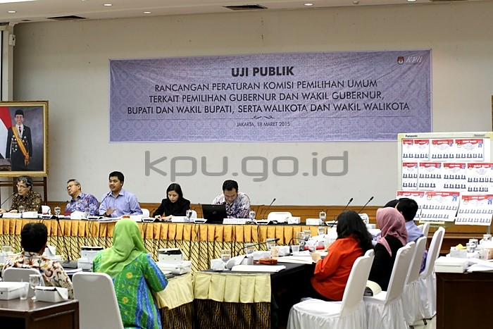 Jakarta, kpu.go.id- Setelah minggu lalu Komisi Pemilihan Umum (KPU) melakukan uji publik terhadap 6 dari 10 draft peraturan yang disiapkan guna menghadapi Pilkada serentak pada bulan Desember mendatang, hari ini (Rabu,18 Maret) dilakukan pembahasan terhadap 4 draft peraturan KPU terkait penyelenggaraan Pemilihan Gubernur dan Wakil Gubernur, Bupati dan Wakil Bupati, serta Walikota dan Wakil Walikota.