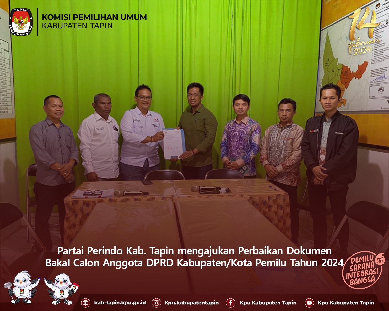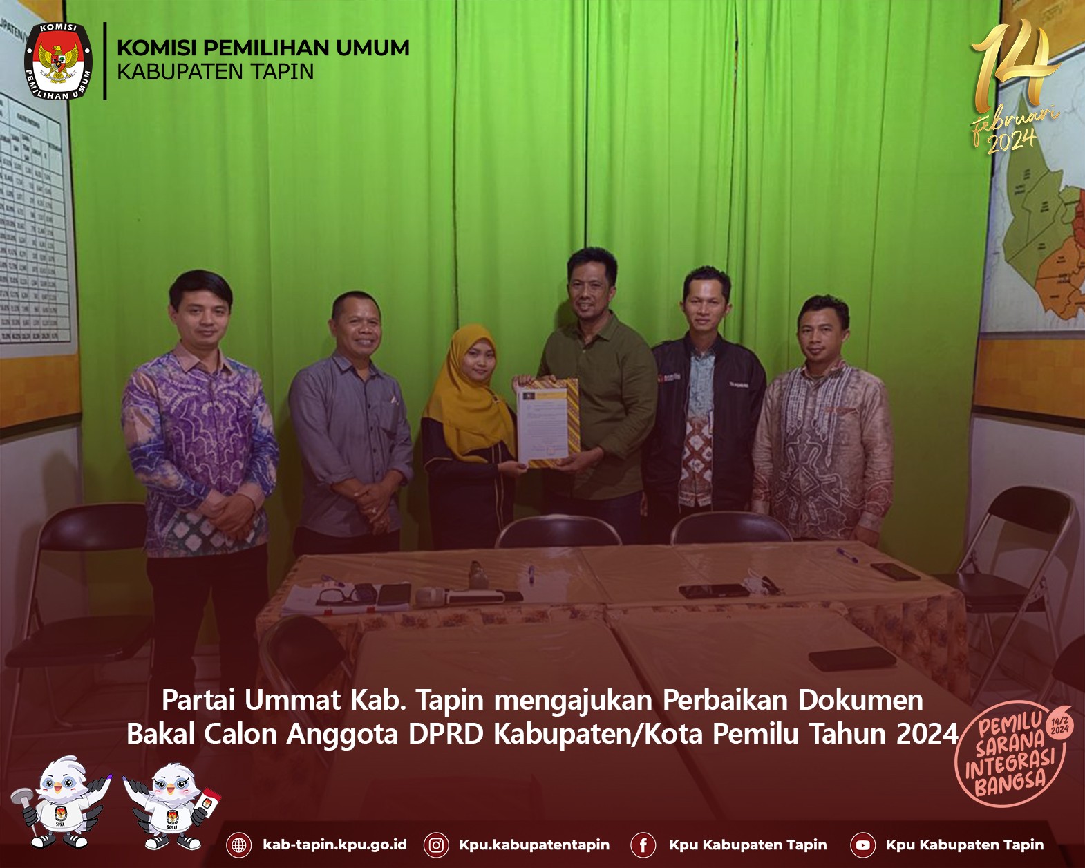 Pengajuan Perbaikan Dokumen tersebut diterima oleh Anggota KPU Kab. Tapin : Fakhrian Noor (Ketua), Mahnuradi, Thessa Ajie Budiono, Tsauban Abqorie, Irfan Rafi'an.
