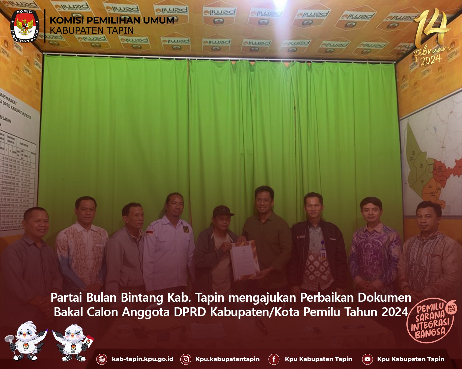 Hai #TemanPemilih, Partai Bulan Bintang Kab. Tapin mengajukan Perbaikan Dokumen Bakal Calon Anggota DPRD Kabupaten/Kota Pemilu Tahun 2024, berlokasi di Kantor KPU Kabupaten Tapin, Sabtu (08/07/2023).