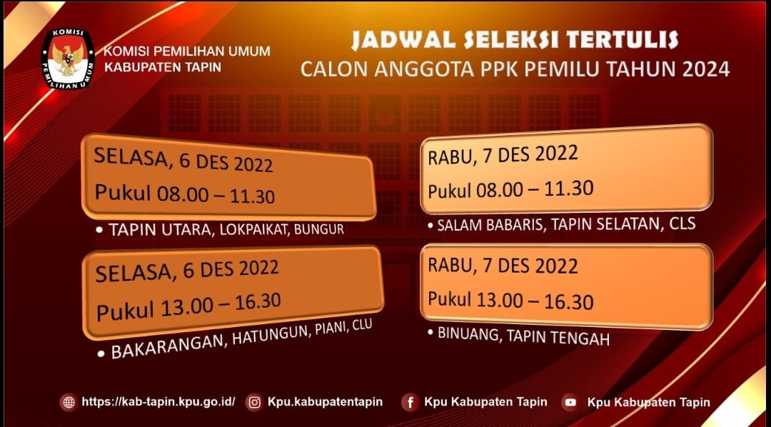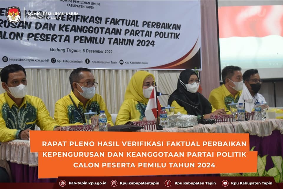 Kamis 8 Desember 2022, KPU Kabupaten Tapin melaksanakan Rapat Pleno Hasil Verifikasi Faktual Perbaikan Kepengurusan dan Keanggotaan Partai Politik Calon Peserta Pemilu Tahun 2024, bertempat di Gedung Triguna By Pass Rantau.