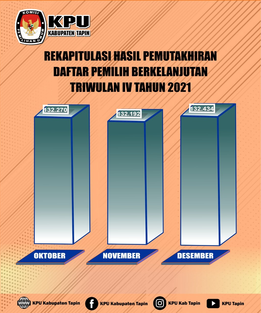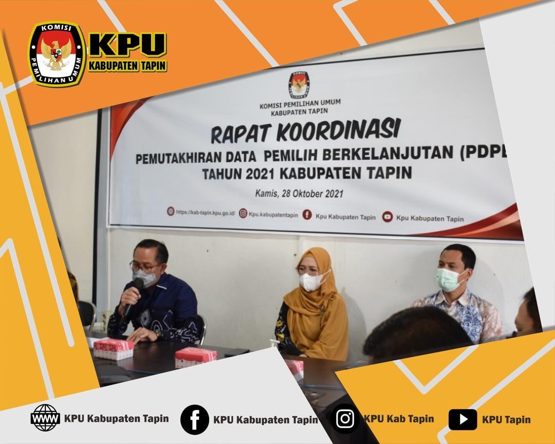 Rantau, kab-tapin.kpu.go.id . Guna memperbaharui data pemilih pasca Tahapan Pemilihan, pada hari Kamis tanggal 28 Oktober 2021, bertempat di Aula Badan Kesatuan Bangsa dan Politik Kabupaten Tapin, KPU Kabupaten Tapin menggelar Rapat Koordinasi Pemutakhiran Data Pemilih Berkelanjutan Tahun 2021. Dengan menerapkan protokol kesehatan, Rapat Koordinasi ini turut mengundang Dinas Dukcapil Kabuapten Tapin, Partai Politik, TNI/POLRI, serta seluruh Stakeholder yang terkait. Kegiatan Pemutakhiran Daftar Pemilih Berkelanjutan (PDPB) sejatinya merupakan kegiatan wajib yang diamanahkan UU diluar Tahapan Pemilu / Pemilihan. Secara garis besar pembaharuan data pemilih ini dilakukan dengan mencoret/mengeluarkan pemilih TMS (Tidak Memenuhi Syarat) maupun menambahkan pemilih baru serta melakukan perbaikan data pemilih. Dengan demikian melalui Kegiatan Pemutakhiran Daftar Pemilih Berkelanjutan (PDPB) ini dapat menghasilkan Data Pemilih yang berkualitas untuk pemilu/pemilihan yang akan datang. Daftar Perubahan Pemilih Hasil Rapat Koordinasi Pemutakhiran Daftar Pemilih Berkelanjutan Tahun 2021 dapat diunduh pada tautan berikut: Hasil PDPB Tahun 2021 (as)