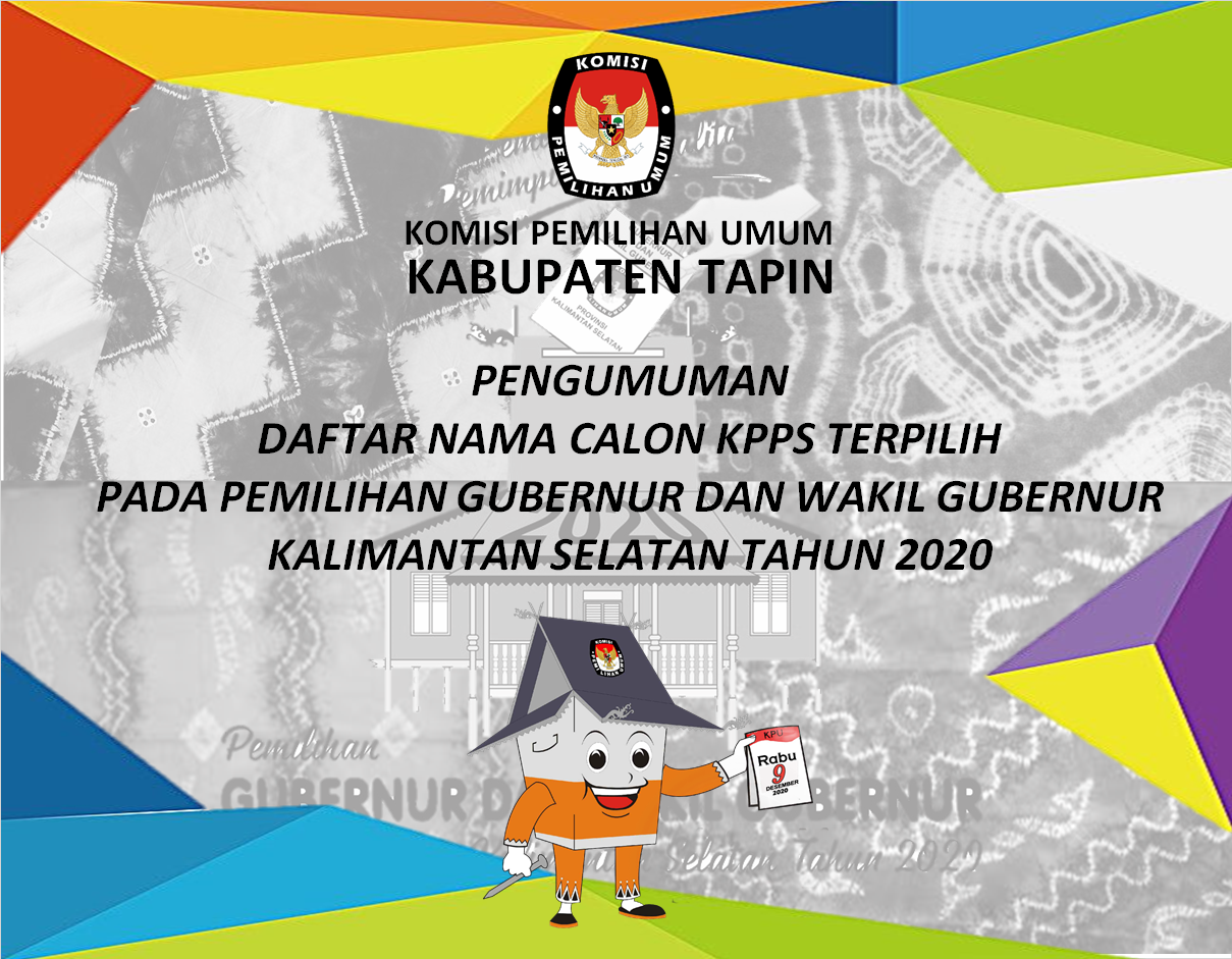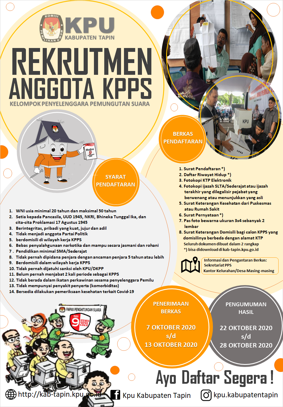 Pengumuman resmi penerimaan pendaftaran calon Anggota KPPS (Kelompok Penyelenggara Pemungutan Suara) pada Pemilihan Gubernur dan Wakil Gubernur Kalimantan Selatan Tahun 2020 telah ditempel di papan pengumuman kantor desa/kelurahan atau lokasi strategis yang mudah dijangkau di desa/kelurahan masing-masing. Untuk informasi lebih lanjut dan pengantaran berkas bisa hubungi langsung di Sekretariat PPS Kantor Desa/Kelurahan masing-masing. Surat pendaftaran, Daftar Riwayat Hidup, dan Surat Pernyataan bisa diunduh dalam link dibawah ini:
