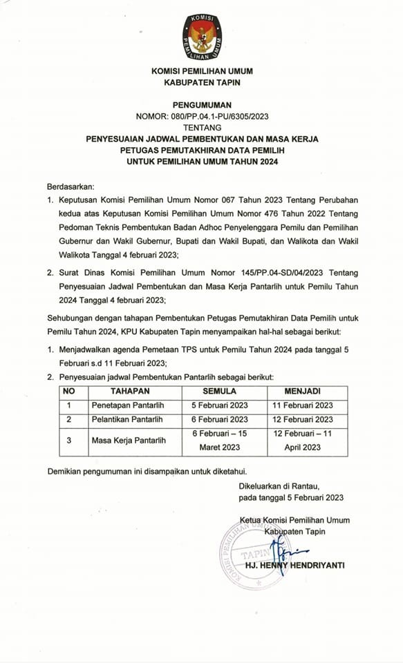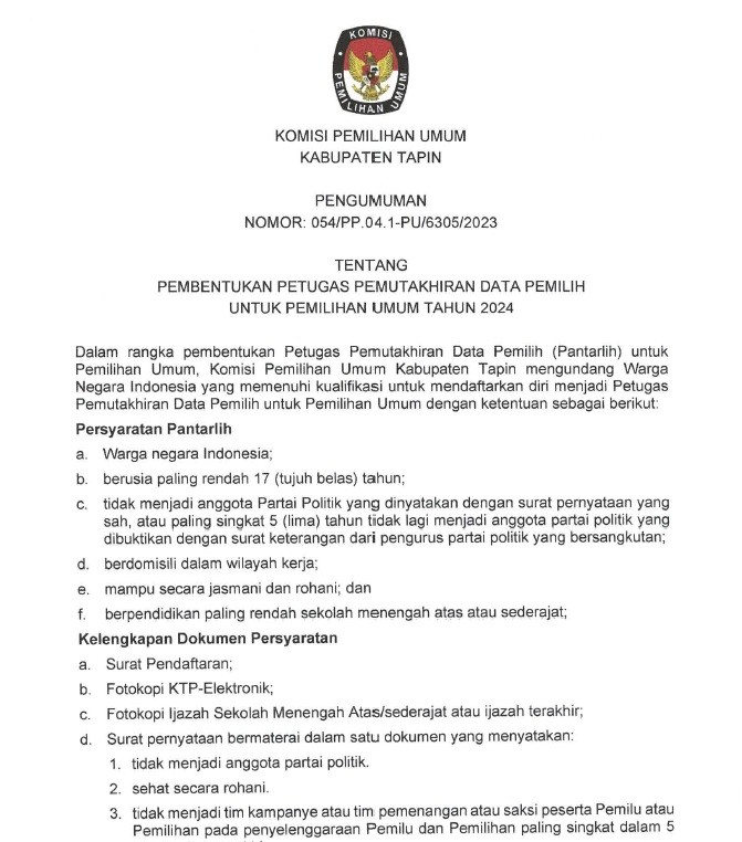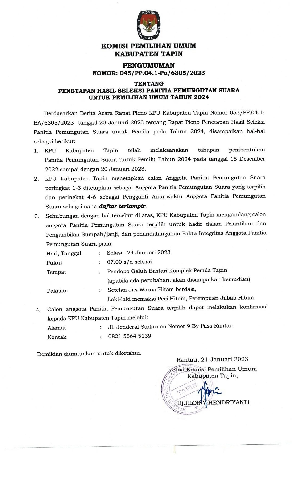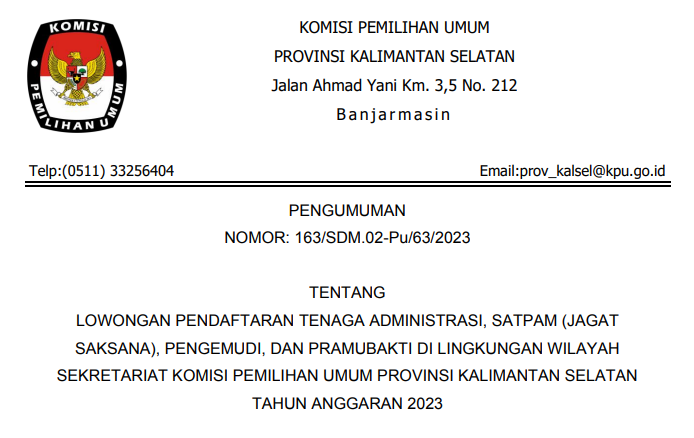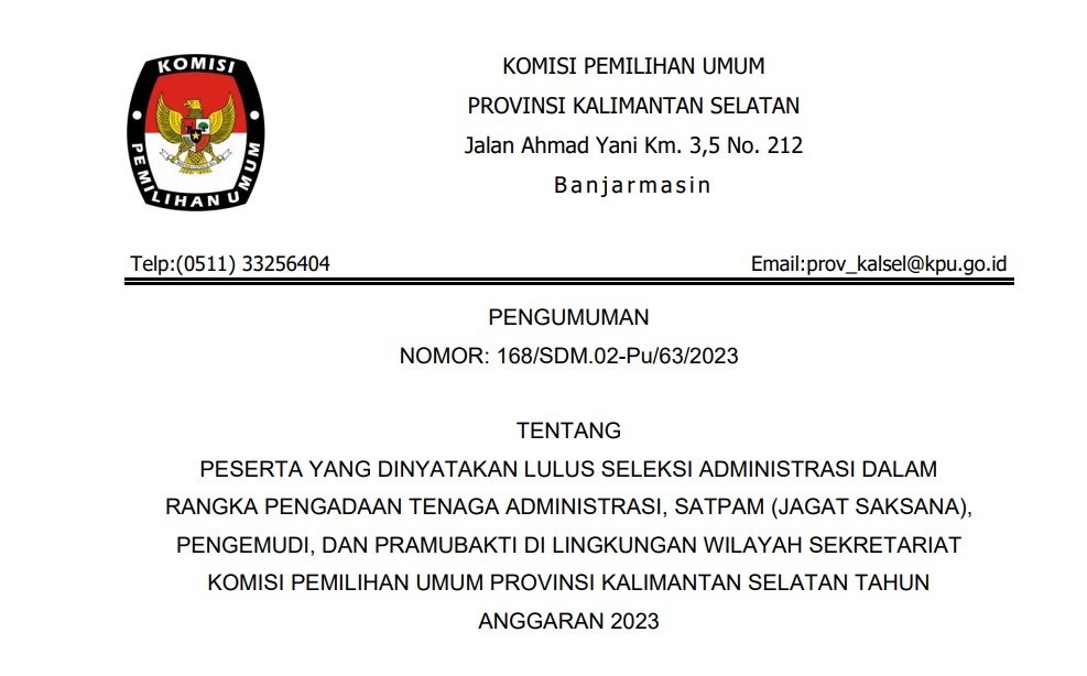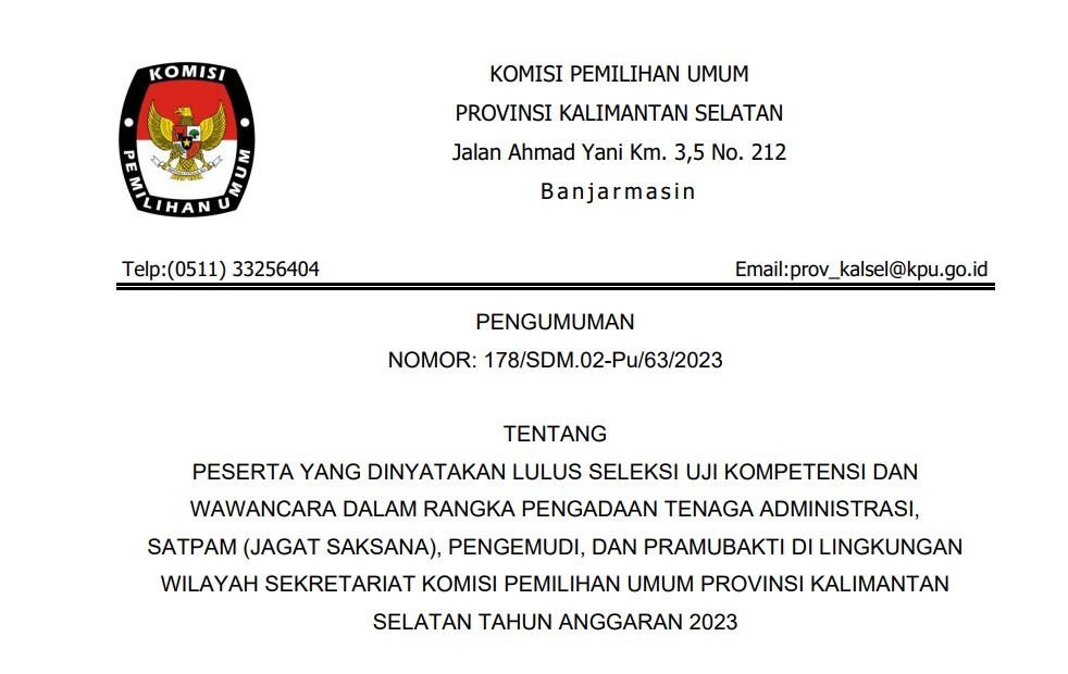 Berdasarkan hasil uji kompetensi dan wawancara calon Tenaga Administrasi, Satpam (Jagat Saksana), Pengemudi, dan Pramubakti di Lingkungan Wilayah Sekretariat Komisi Pemilihan Umum Provinsi Kalimantan Selatan Tahun Anggaran 2023, dengan ini Panitia Pengadaan Tenaga Administrasi, Satpam (Jagat Saksana), Pengemudi, dan Pramubakti di Lingkungan Wilayah Sekretariat Komisi Pemilihan Umum Provinsi Kalimantan Selatan Tahun Anggaran 2023 menyampaikan hal-hal sebagai berikut: [KLIK DISINI]